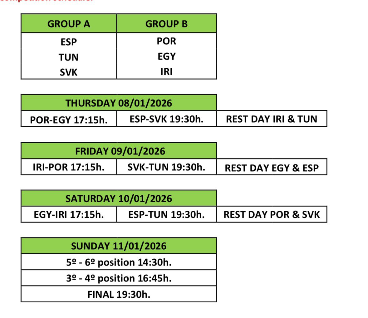 وفي خطوة مهمة لتعزيز جاهزية الفريق، يشارك منتخب مصر الأول لكرة اليد في الدورة الدولية الودية التي تستضيفها إسبانيا خلال الفترة من 8 إلى 11 يناير 2026، بمشاركة 6 منتخبات عالمية تم تقسيمها إلى مجموعتين، وتضم مصر والبرتغال وإيران وإسبانيا وتونس وسلوفاكيا.